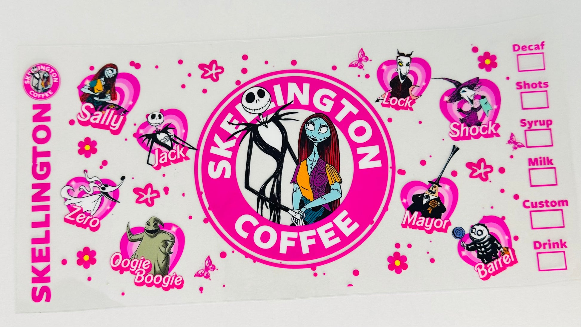 Experience the unique charm of Skellington Coffee, inspired by Jack Skellington and Sally’s own quirky coffee shop. Complemented with black, pink, and silver glitter and a cute glittered top with a straw topper.